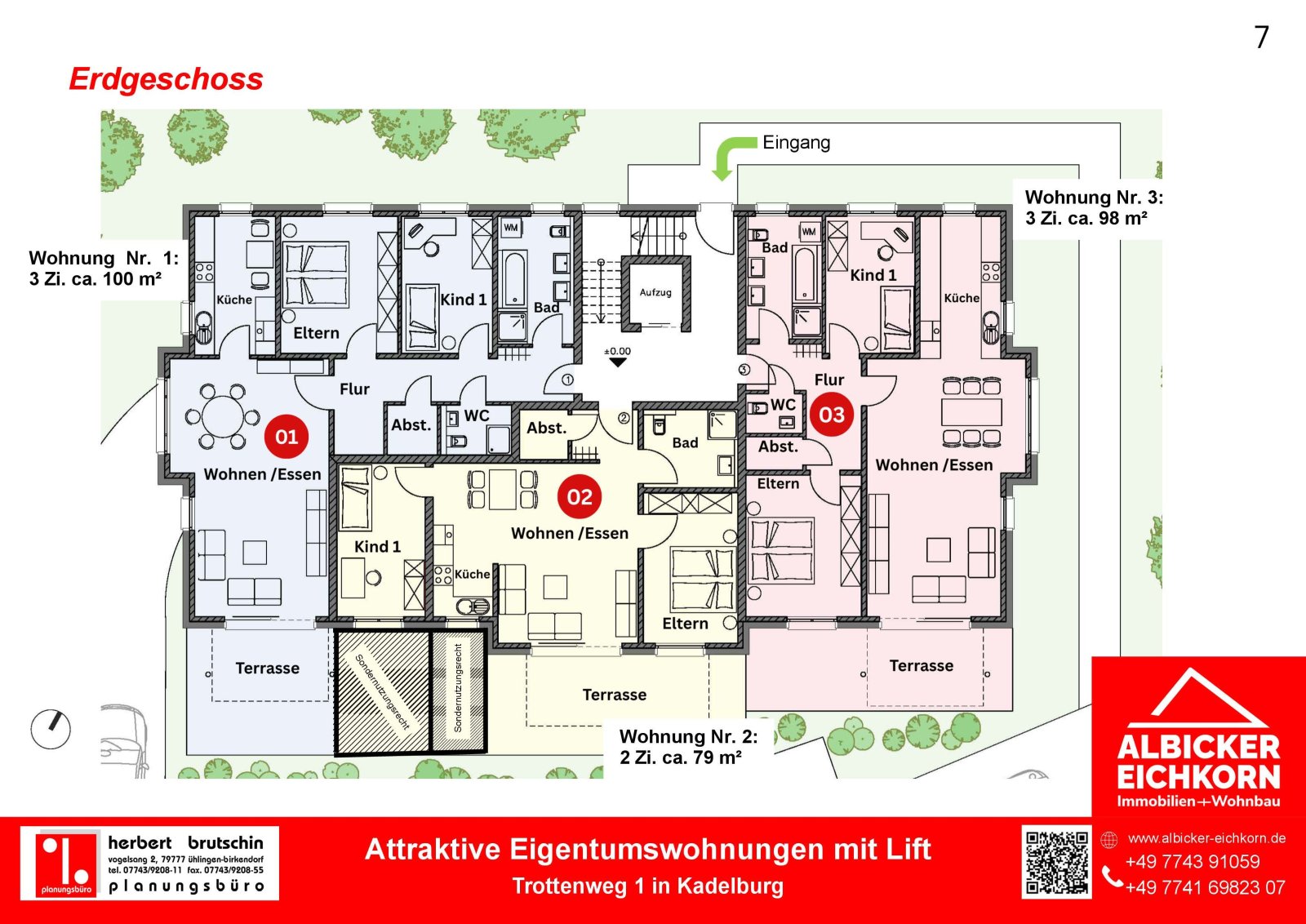 In zentraler und ruhiger Wohnlage von Kadelburg entsteht unser Mehrfamilienwohnhaus “Trottenweg 1”, verkehrsgünstig gelegen, nur wenige Gehminuten vom Dorfzentrum entfernt. Mit 9 Wohneinheiten in massiver Kalksandsteinbauweise errichtet, wird das Haus dem Ruhe- und Erholungsbedürfnis der Bewohner in besonderer Weise gerecht. Moderne Bauelemente in Verbindung mit traditioneller Handwerkskunst ergeben wohnliche und wertbeständige Eigentumswohnungen. Eine moderne Heizung ermöglicht zusammen mit dem hervorragenden Wärmeverbundsystem das Standard Effizienzhaus - Klimafreundliches Wohngebäude (KFN). Für den Bewohner bedeutet dies wohlige Wärme bei geringen Heizkosten. Die variable Grundrissgestaltung und das helle, lichtdurchflutete Interieur ermöglicht individuelles Wohnen in zeitgemäßem Ambiente. Vom 2-Zimmer Appartement bis zur 4-Zimmer Wohnung sind fast alle Wohnungsgrößen realisierbar.